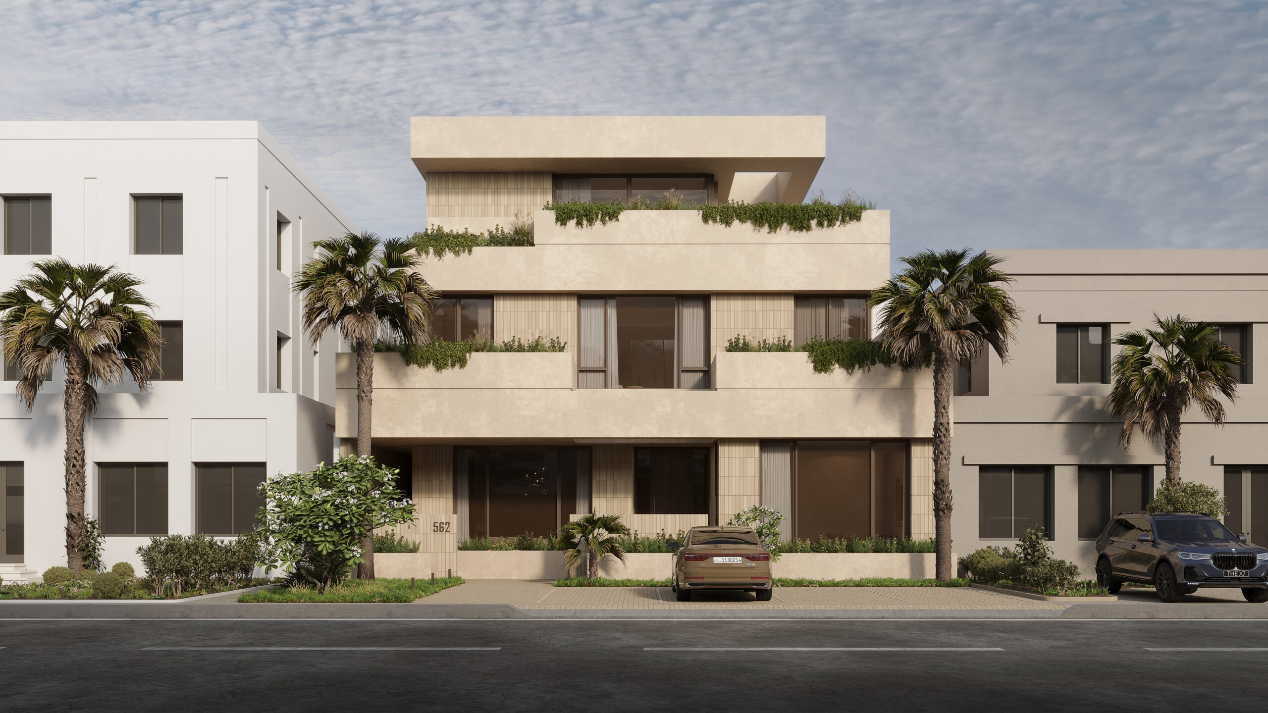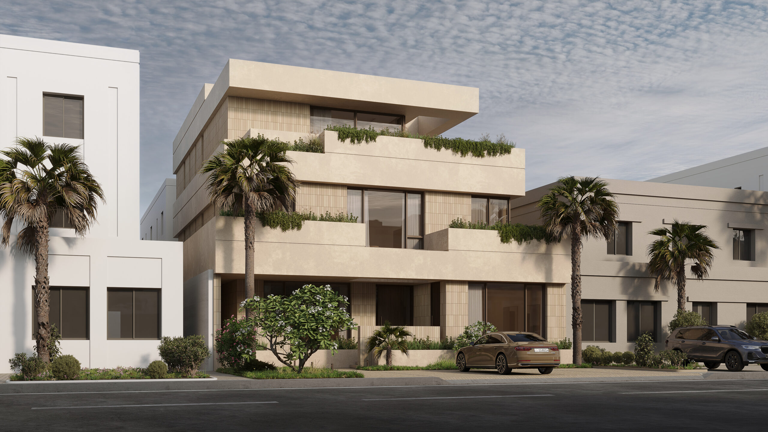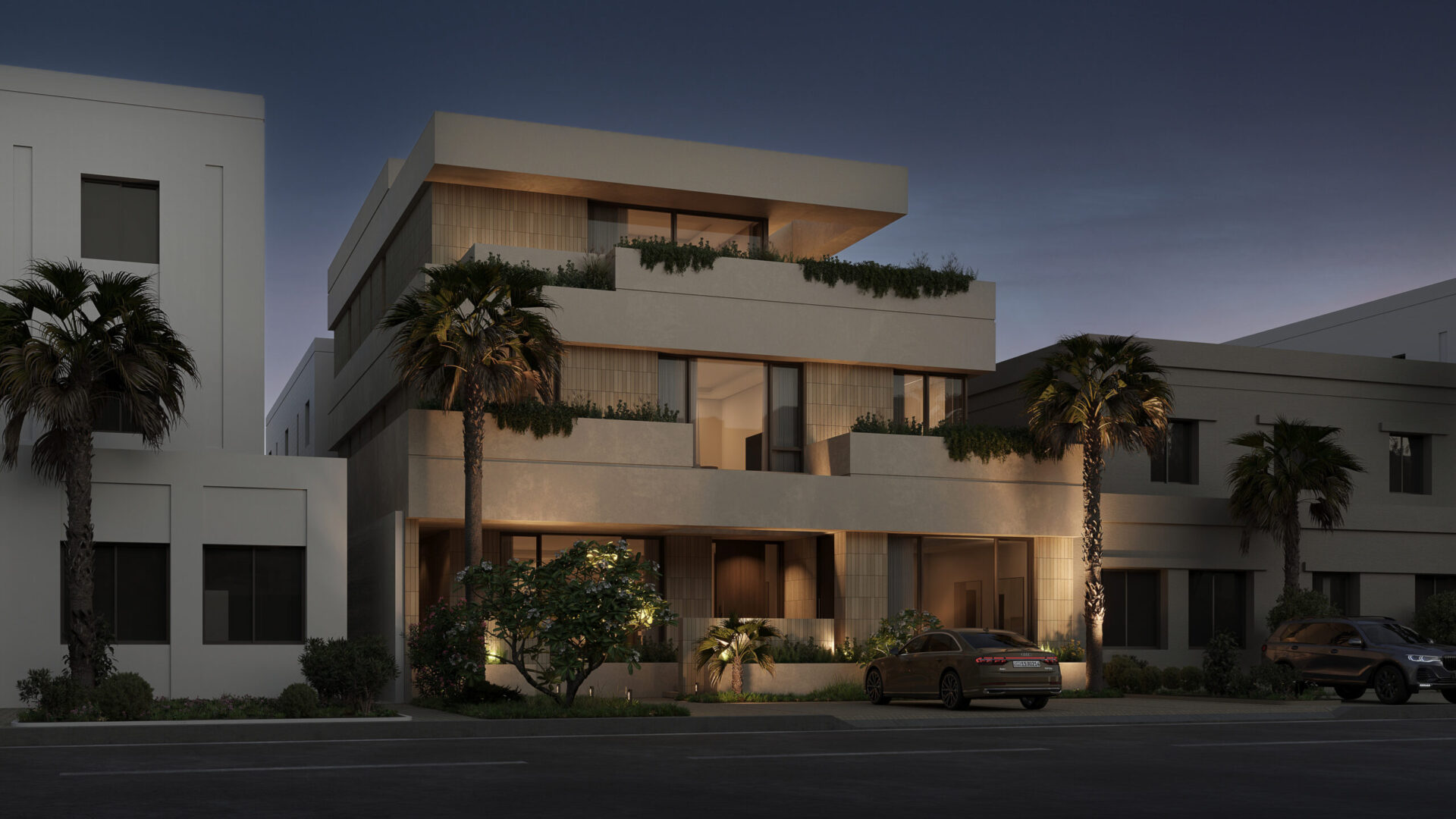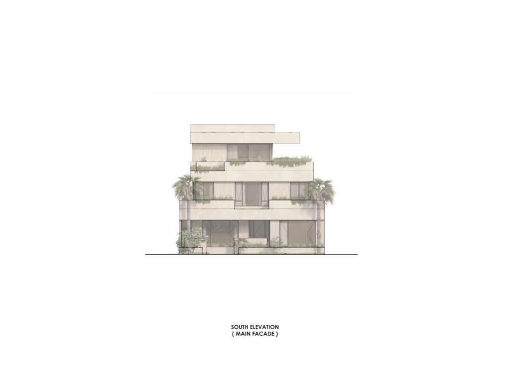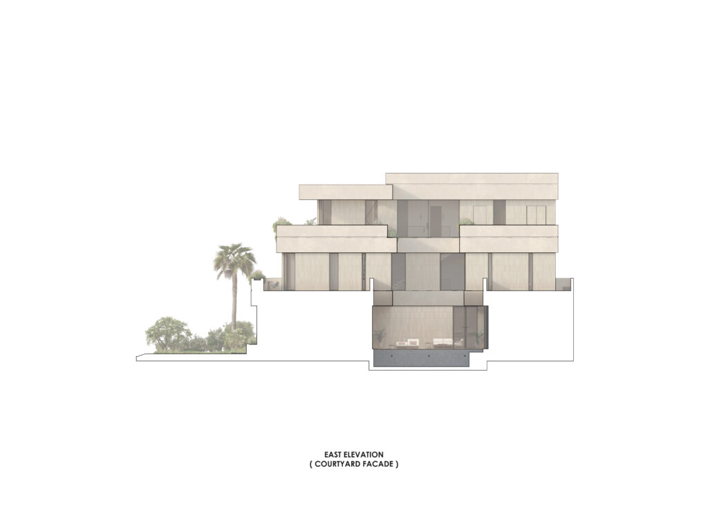 Conceptually the villa is designed as a series of stacked floors separated vertically by overhanging bands or slabs. The overhangs serve multiple purposes as they provide shade and cover from the sun as well as extend to provide terraces and outdoor spaces on all levels. The bands also are lined in some places with parapets that act as plant beds, this allows for a connection to nature, privacy from neighbors, and provide a visual middle ground between interior spaces and the streetscape.