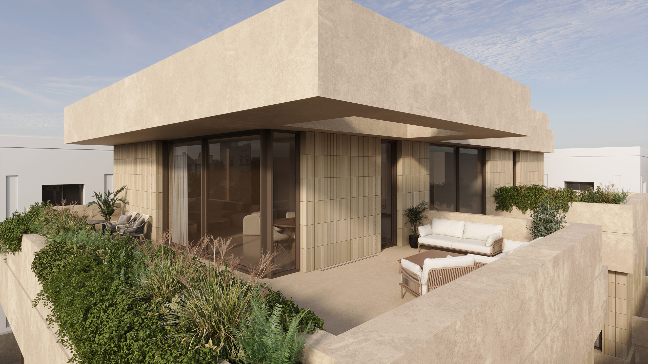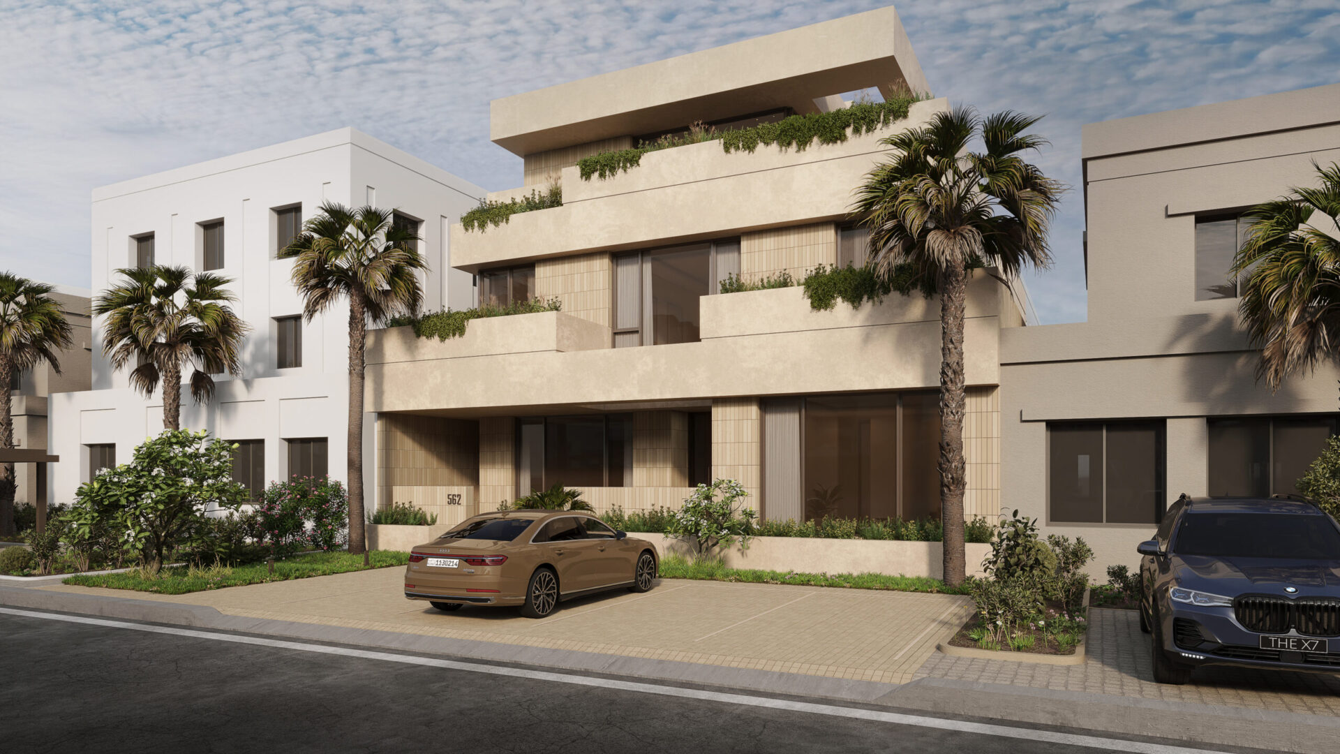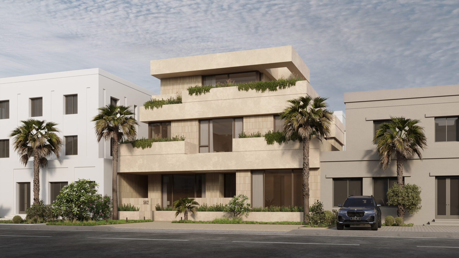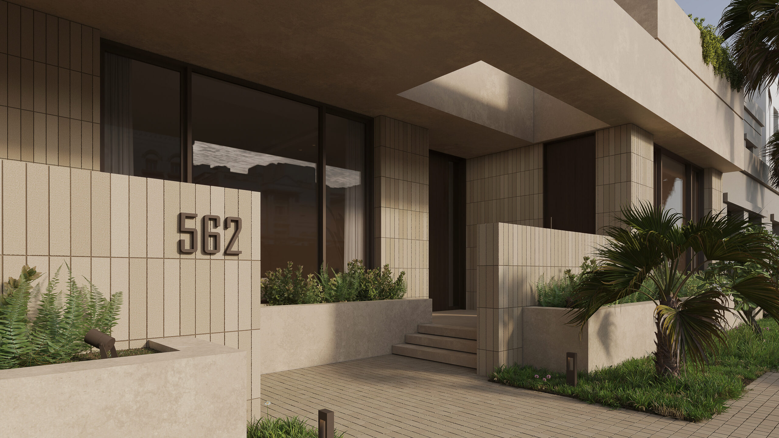 Conceptually the villa is designed as a series of stacked floors separated vertically by overhanging bands or slabs. The overhangs serve multiple purposes as they provide shade and cover from the sun as well as extend to provide terraces and outdoor spaces on all levels. The bands also are lined in some places with parapets that act as plant beds, this allows for a connection to nature, privacy from neighbors, and provide a visual middle ground between interior spaces and the streetscape.