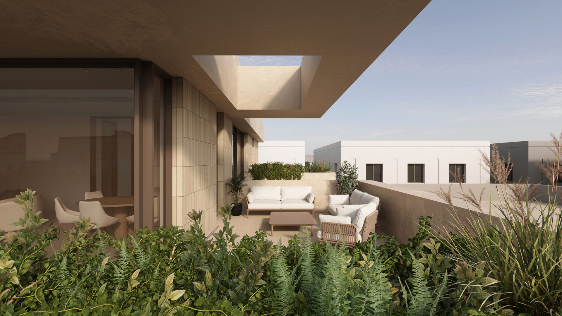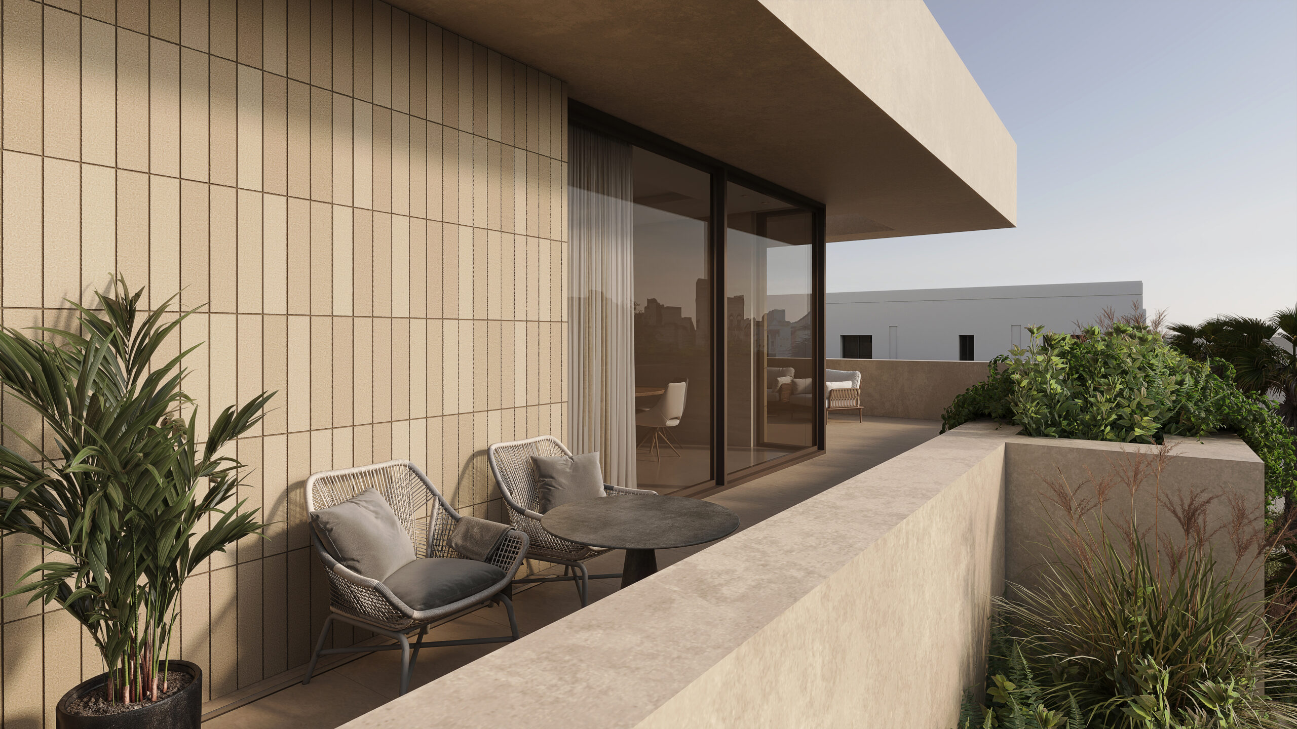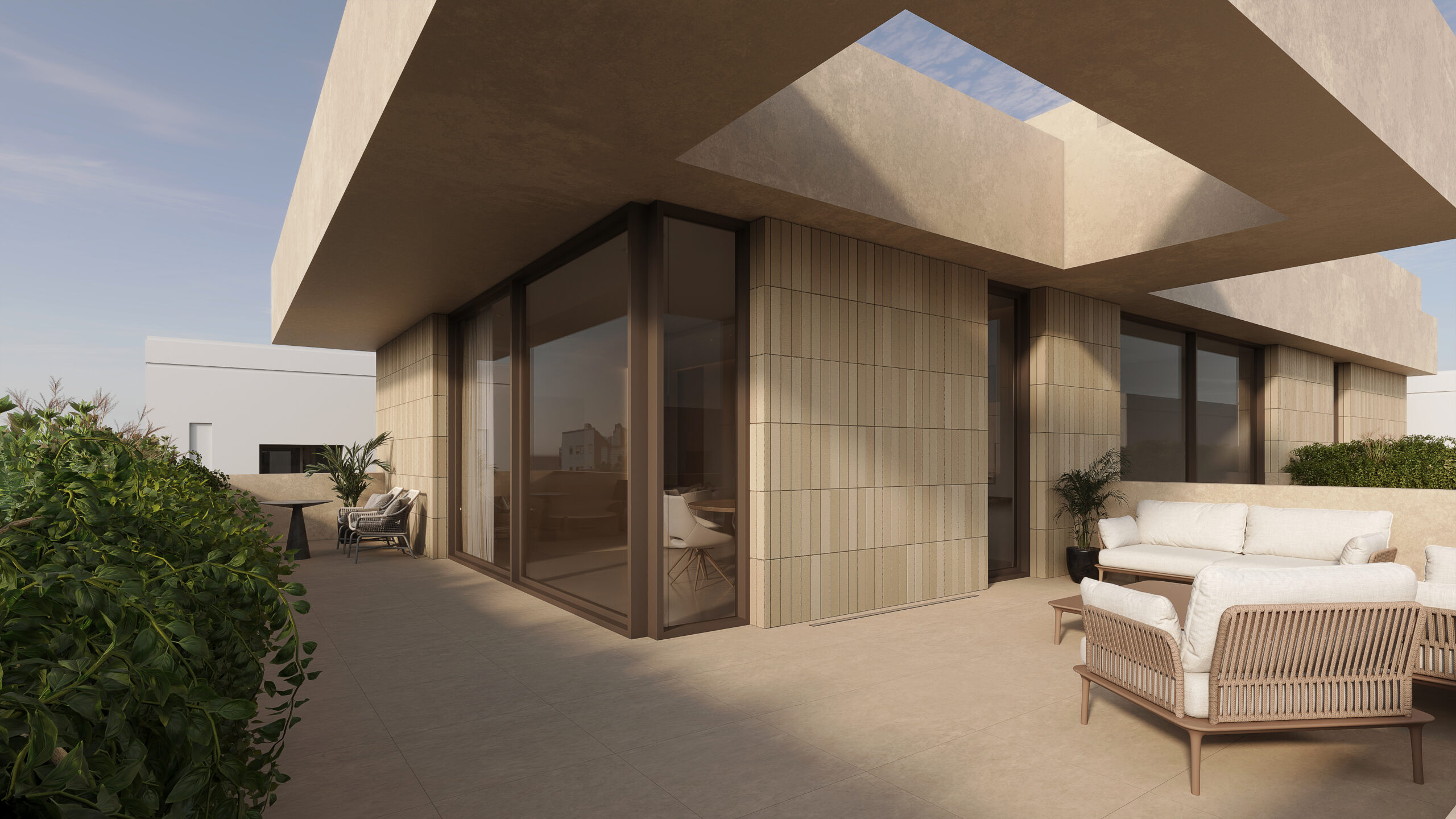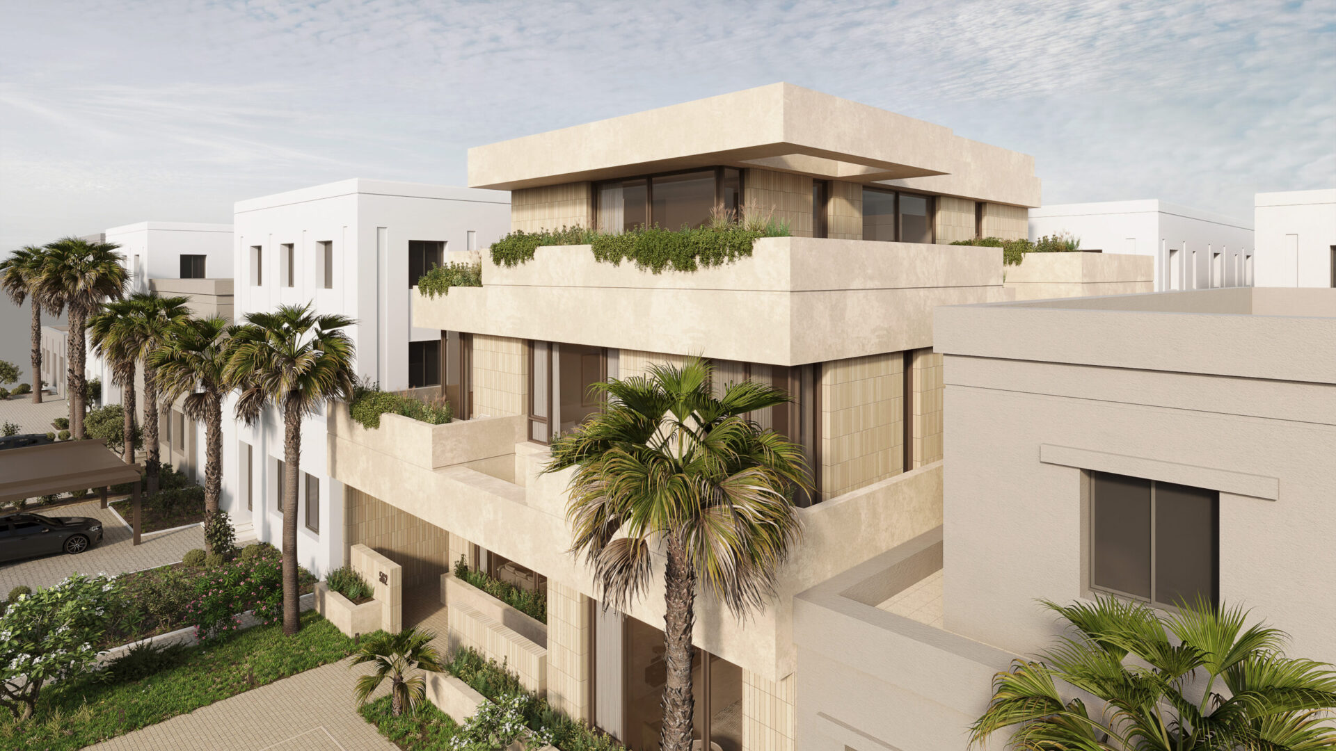 Conceptually the villa is designed as a series of stacked floors separated vertically by overhanging bands or slabs. The overhangs serve multiple purposes as they provide shade and cover from the sun as well as extend to provide terraces and outdoor spaces on all levels. The bands also are lined in some places with parapets that act as plant beds, this allows for a connection to nature, privacy from neighbors, and provide a visual middle ground between interior spaces and the streetscape.